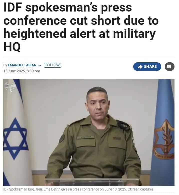 另据《以色列时报》13日晚报道,当晚以色列国防军在基里亚基地召开的新闻发布会也因安全警报中断。